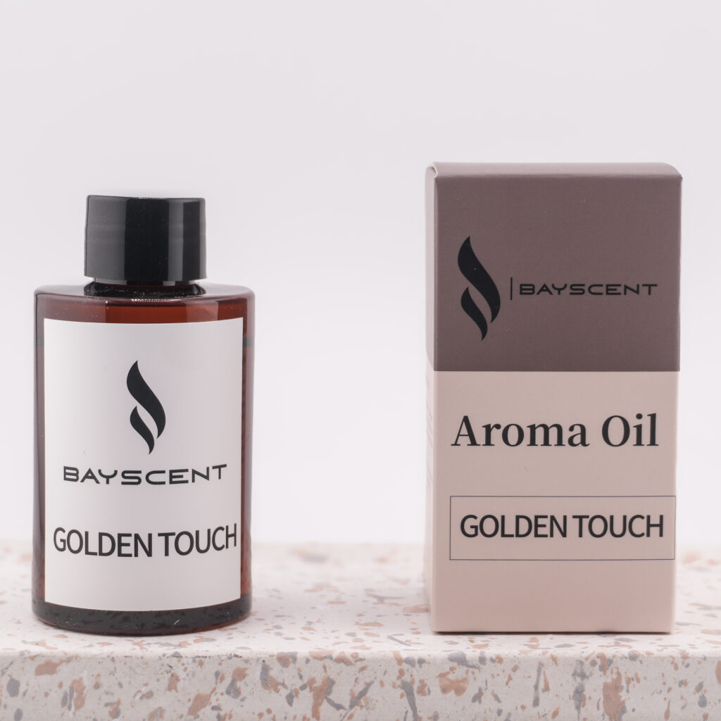 Würzig, cremig und edel – mit Kastanie, Kardamom und Amberwood. GOLDEN TOUCH hüllt Räume in eine warme, luxuriöse Atmosphäre – perfekt für Concept Stores, Hotellounges oder Designstudios.